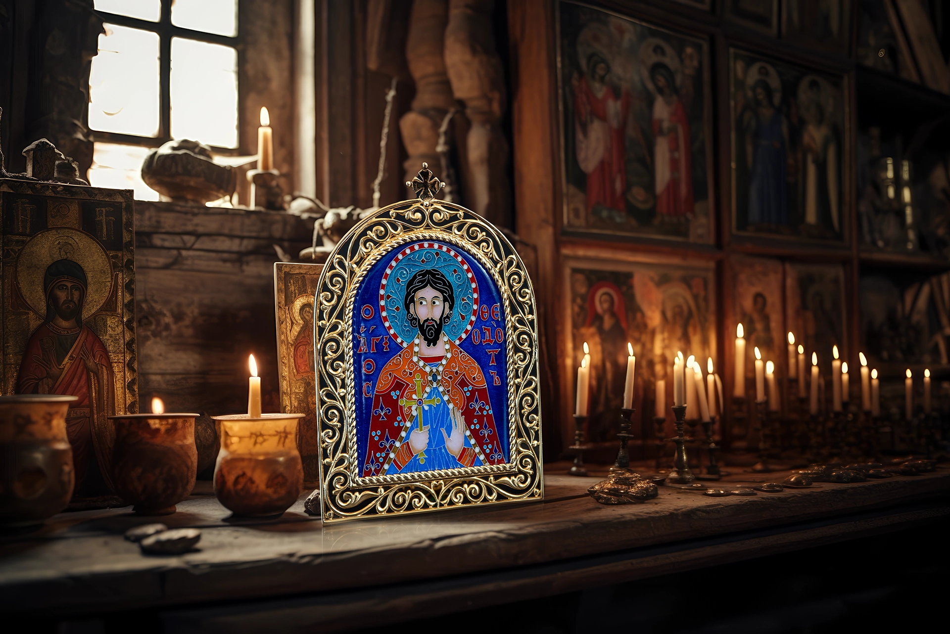 This table icon features Saint Theodotus, a revered Christian martyr known for his unwavering faith, courage, and sacrificial devotion during times of persecution. His image serves as a powerful reminder of spiritual strength, steadfastness, and love for Christ.